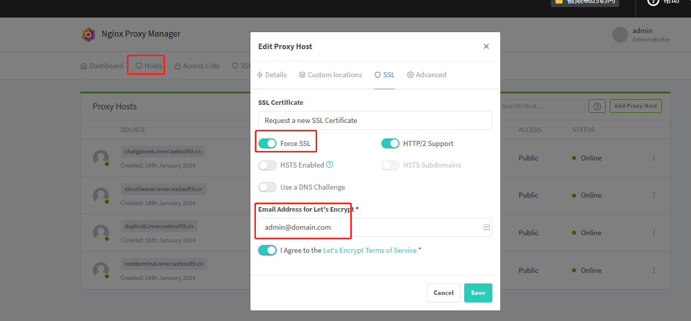 2. 编辑目标应用的 Proxy Host, SSL 标签页中勾选 Force SSL 即可