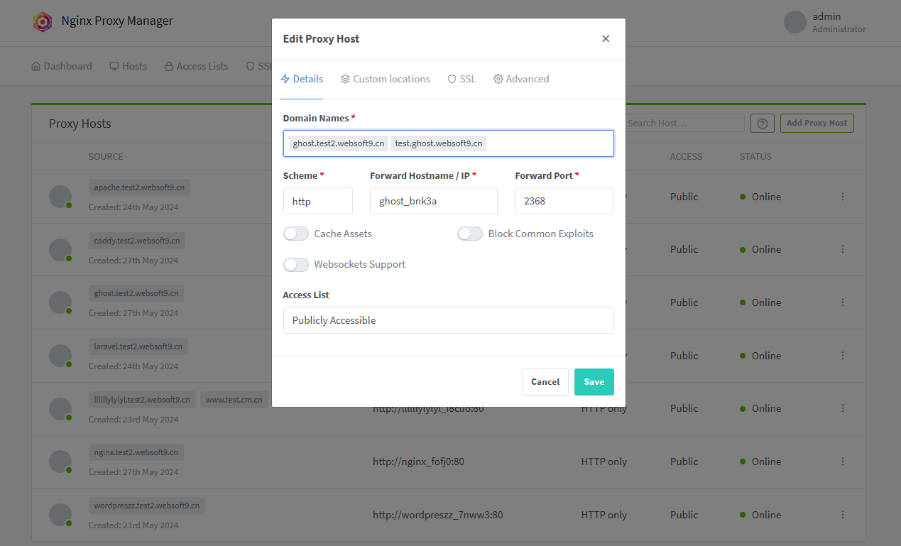 1. 进入 Websoft9 控制台 网关 模块,依次打开菜单: > Hosts > Proxy Hosts